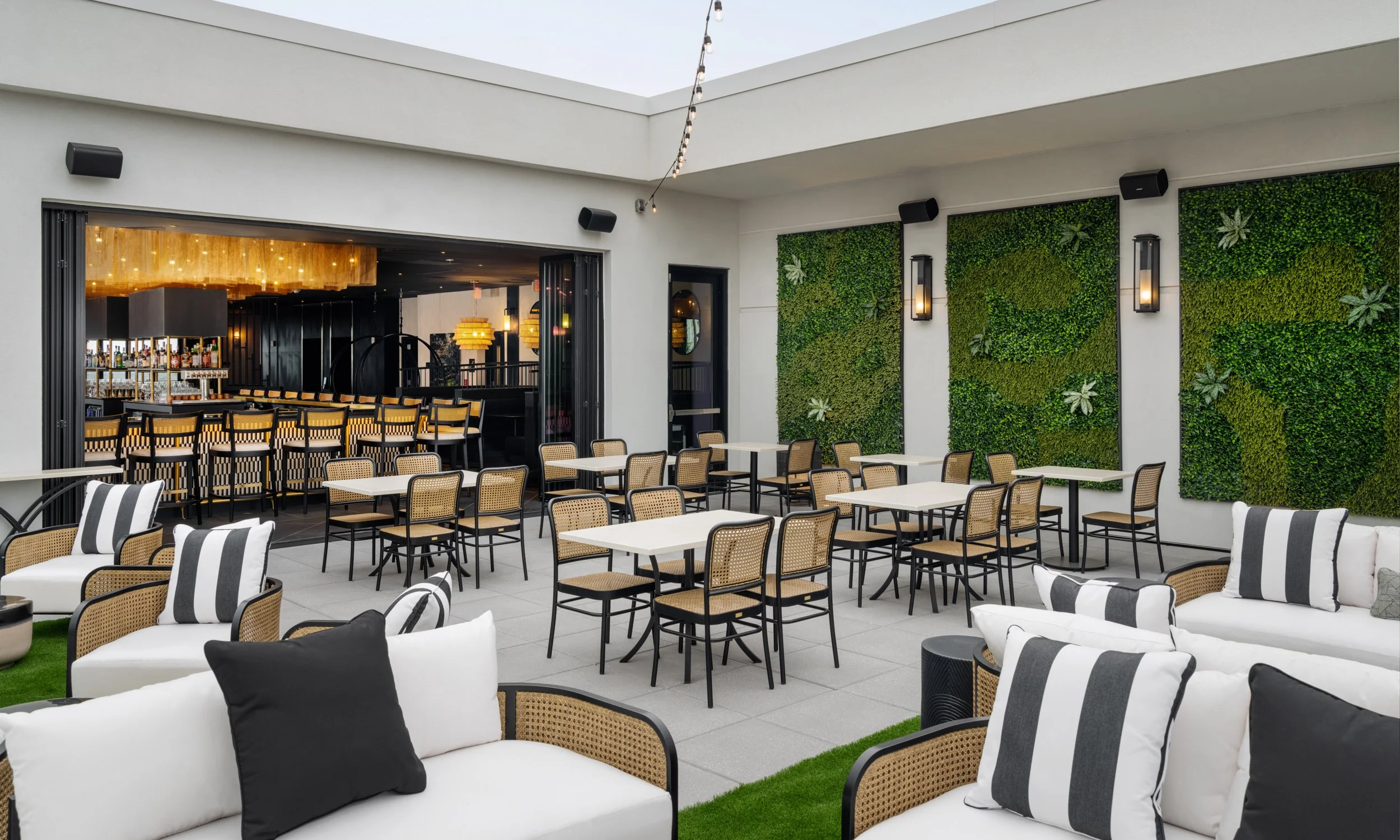 Two different outdoor spaces await you. An open, uncovered patio on the north side blends dining tables with comfortable sofas amid lush greenery and starry skies. On the south side is our covered patio, shaded and chic, with expansive vistas. Poised in the middle is a lounge that wraps you in a sophisticated ambiance, a modern take on classic glamour.