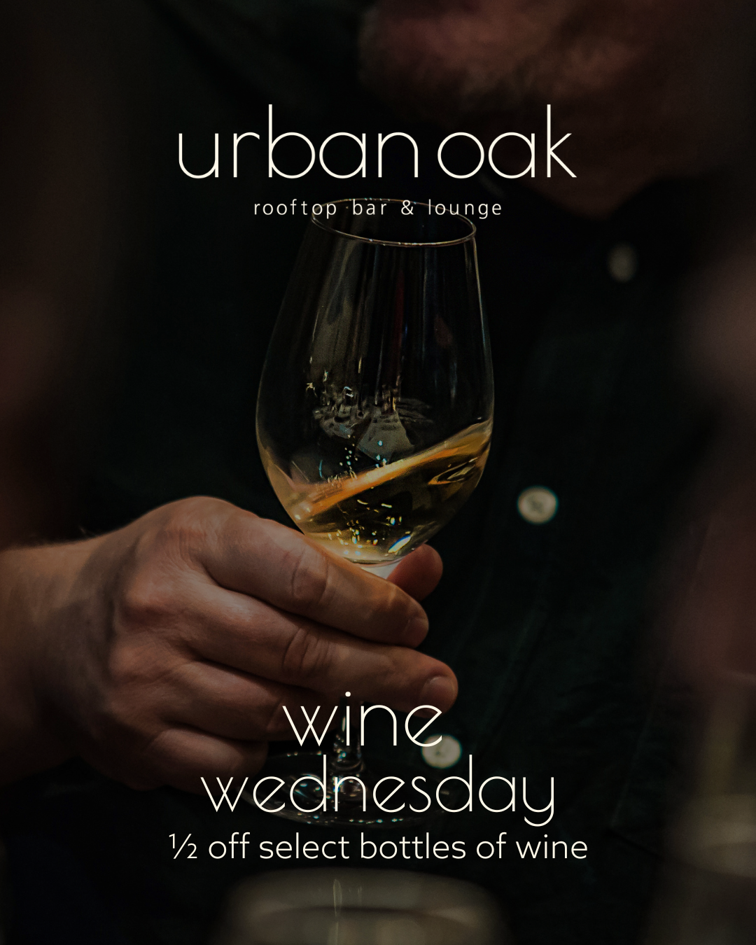 Wine Wednesday at Urban Oak takes place every Wednesday on the 14th floor. Enjoy half off select bottles of wine when you dine with us, making it the perfect midweek reason to gather with friends and linger a little longer. Join us for an elevated evening with great wine, great company, and skyline views.